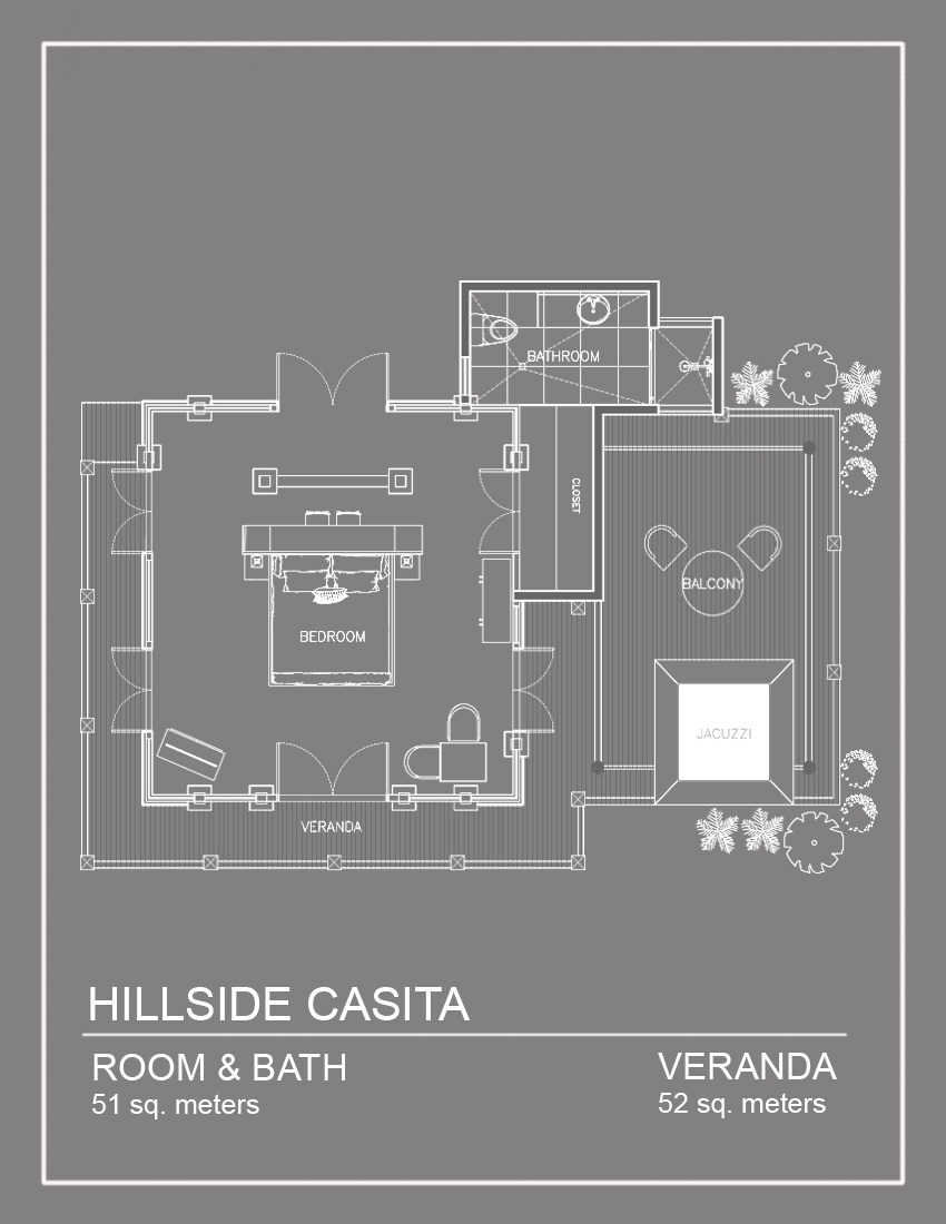 Ultimate privacy is a hallmark of this room. Located on a hilltop facing the west part of the resort, the Hillside Casita offers beautiful hardwood interiors with a serene ambiance and contemporary furnishings, creating a harmonious blend of comfort and sophistication. The centerpiece of this haven is the private jacuzzi where you can immerse yourself and let the therapeutic jets melt away all your stresses.