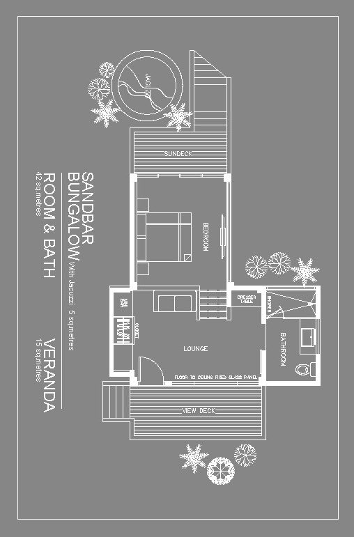 The Sandbar Bungalow is the only one of its kind on the island. As its name implies, it is located literally on the pointed tip of the island where the beautiful sandbar is connected to an islet. The room is furnished with a king-sized bed with an elegant aged woods tiled headboard discarded from old railroad tracks. From the bedside, a sliding door opens to a verandah with an outdoor plunge pool built and blended with the natural rocks. A few steps down is a small private sunset beach cove. From the room lounge sofa, another sliding door opens to a verandah facing sunrise where a few steps away is the sandbar. Rich hardwood floors, bathroom with a glass walled shower with outdoor natural rocks as a landscape, a 400mm jumbo rainshower, breathtaking unobstructed east and west views of the ocean and surrounding islands are the highlights of this unique bungalow.